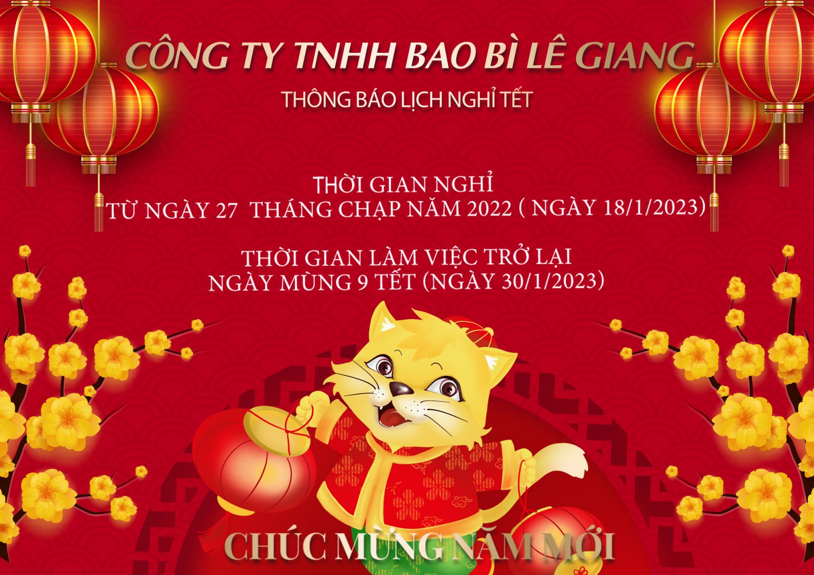 CÔNG TY TNHH BAO BÌ LÊ GIANG Gửi đến Quý Khách Hàng Lịch Nghỉ Tết Năm 2023